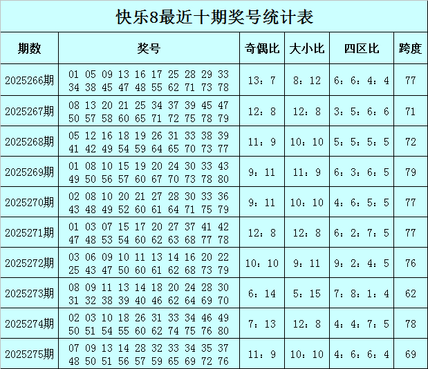 福彩感奋8第2025275期开奖追念:07 09 13 14 28 32 33 34 35 37 48 50 51 56 57 59 65 69 72 76,其中奖号奇偶比开出11:9,大小比开出10:10,包含6个小奇号码:07 09 13 33 35 37,4个小偶号码:14 28 32 34,5个大奇号码:51 57 59 65 69,5个大偶号码:48 50 56 72 76。