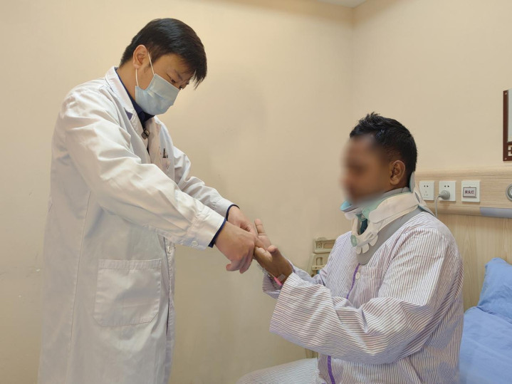 颈肩难熬跨国求医 四个月前,HAI短暂出现颈肩部胀痛,左侧尤为涌现,难熬顺着左上臂、下臂外侧辐射发作,夜间痛得无法安睡。 “我的左臂肩膀以上部位剧痛难忍。难熬从左肩扩张到左臂,不是一般的难熬,而是剧烈的难熬。”HAI说。在泰国病院就医时,HAI被确诊为“颈椎间盘凸起伴神经根受压”,过程止痛、养分神经等休养,但症状恒久莫得改善。 在一位曾在南边中西医告捷手术并康复的番邦一又友勤苦推选下,HAI玩忽踏上了前去中国的求医之路。 “我的确无法哑忍,就来到了中国看大夫,脊柱骨病科大夫给我作念了手术,手术很告捷,我当今复原得很好。”术后,HAI即刻就能在颈托保护下下地行动,颈肩及上肢的辐射痛已基本磨灭。HAI用双手竖起的大拇指,抒发了他最平直的笃定。